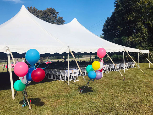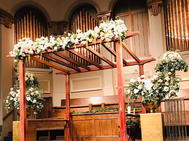 Fun! We enjoyed creating a circus atmosphere for this bride who’s sense of whimsey was delightful. We brought her idea to reality with our vintage bottles full of blooms, extra large balloons and burlap runners over our white tablecloths. The floral arbor inside the church…