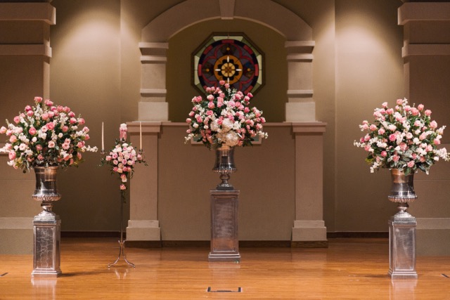 Tyler had one main choice in the flowers – he wanted an amazing silver urn filled with dozens of perfect D’ela cream French roses to greet all the guests in the foyer. This classic design filled the foyer with beauty and scent.